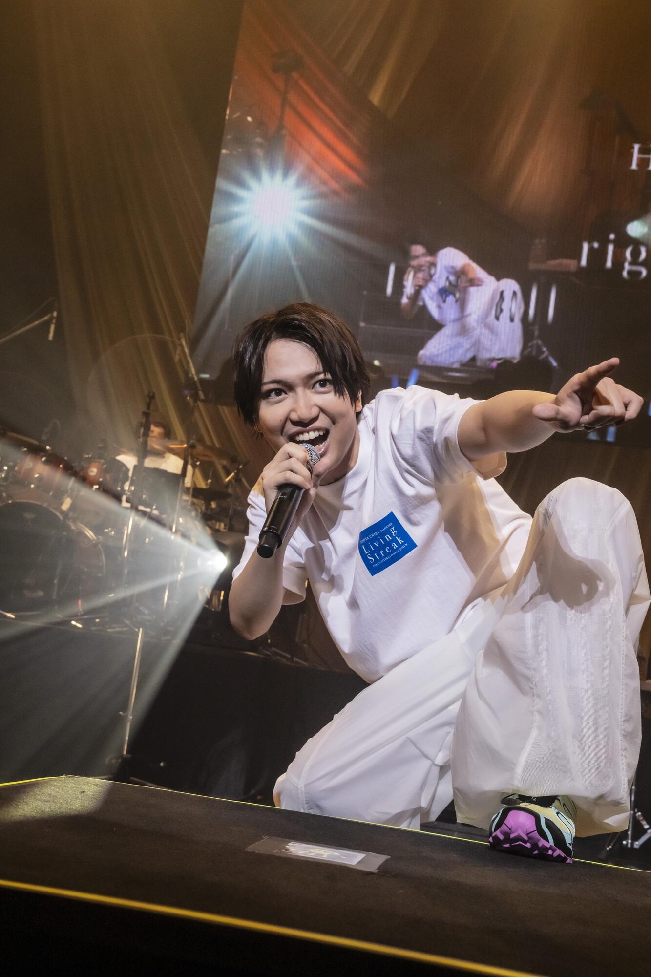 「楽しんでますか! 昨年ソロアーティストデビューさせていただいてから、ついに1stライブです。僕はめちゃくちゃ楽しみにしてたんですけど、(みんなも)楽しみにしてましたか?:場内が頷きで埋まると、「遊ぶ準備出来てますか! 声枯らせますか? 今日はこれまで創ってきた楽曲をすべて披露するライブとなっておりますので曲数まで全部バレている状態なんですけど(場内笑)。『Streak』は光をテーマに創ったアルバムで、今日のライブも皆さんに光を感じていただける様な、明日から、もっともっと前に進んでいけて、目線が少しでも前に向く、僕自身がそう思える様なライブにしたいと思っていますので、最後まで付いて来て下さい」