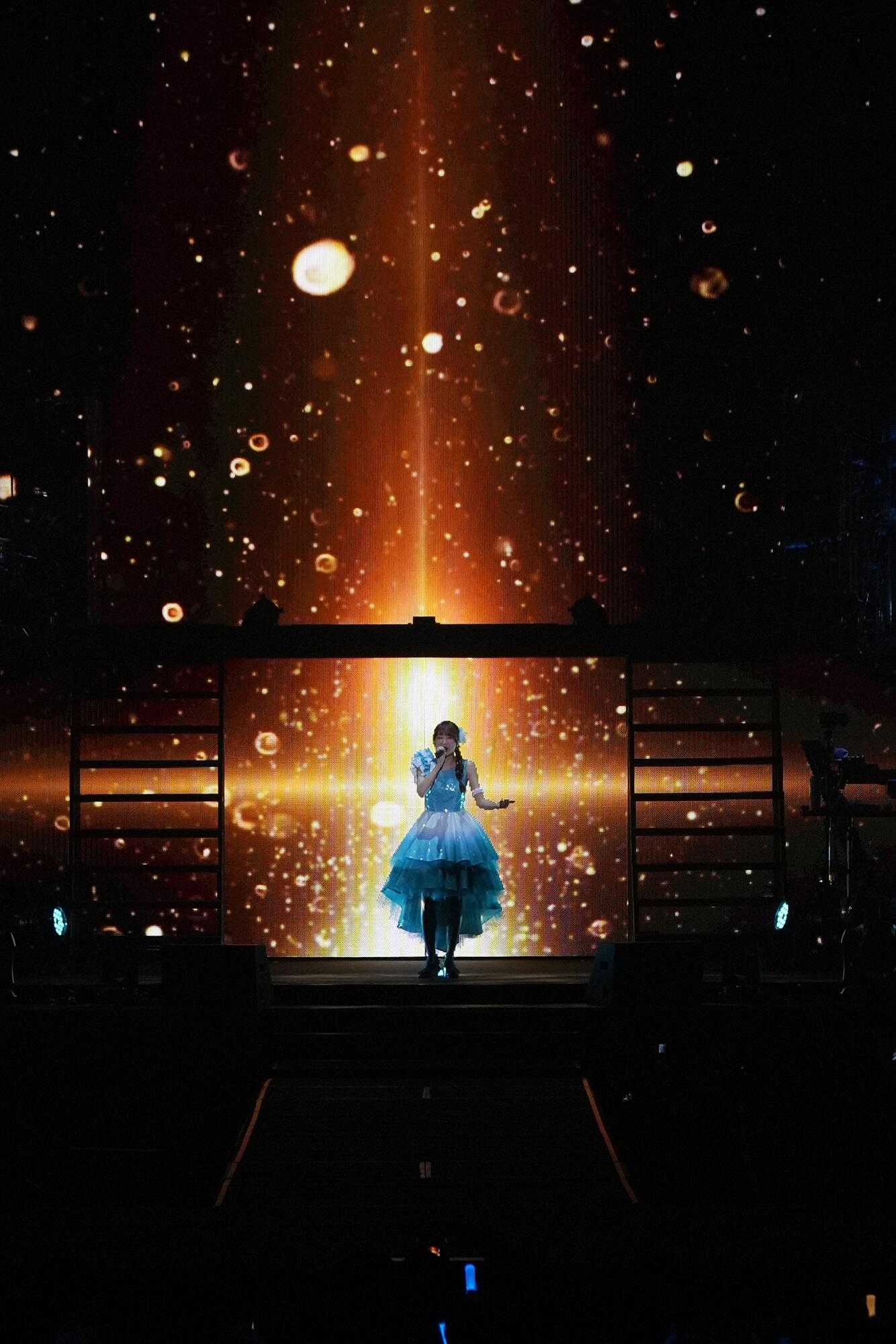 暗転し漂う風船、月が水平線に沈むイメージが映し出され、その間に紗幕で覆われたステージに鮮やかな黄色のドレスに着替えた水瀬いのりが登場。ピアノ伴奏から『BLUE COMPASS』へ。「変われるはずないなんて思ってた あの日のうつむく自分に でも手をのばせば変わる明日があるってこと 教えてあげたい」と深海をイメージした演出で唄い、5周年を記念して開催された、横浜アリーナでの無観客ライブをオマージュ。紗幕が降り、青いコンパスが大きく映し出される演出とともに自らの唄声で観客を魅了する。スポットライトに照らされてセンターステージへ進むと、Day1での『ココロソマリ』から変えて、櫻澤ヒカルと詞を共作した『Starlight Museum』へ。「まだ小さな一歩でもいい 信じよう ねぇ飛べるよ 一人じゃないこと 教えてくれたね」と全方位のファンに唄声を届ける。感極まって声を詰まらせる水瀬いのりを「ねぇ飛べたよ ここまで来れたよ」と町民がアシスト。気を取り直した水瀬いのりは「ありがとう、好きだよ!」と合唱、「歌声は彼方に あの空に響いたハーモニー」「重ねた音色は Starlight Museum 星空になる」とハイトーンを響かせる。