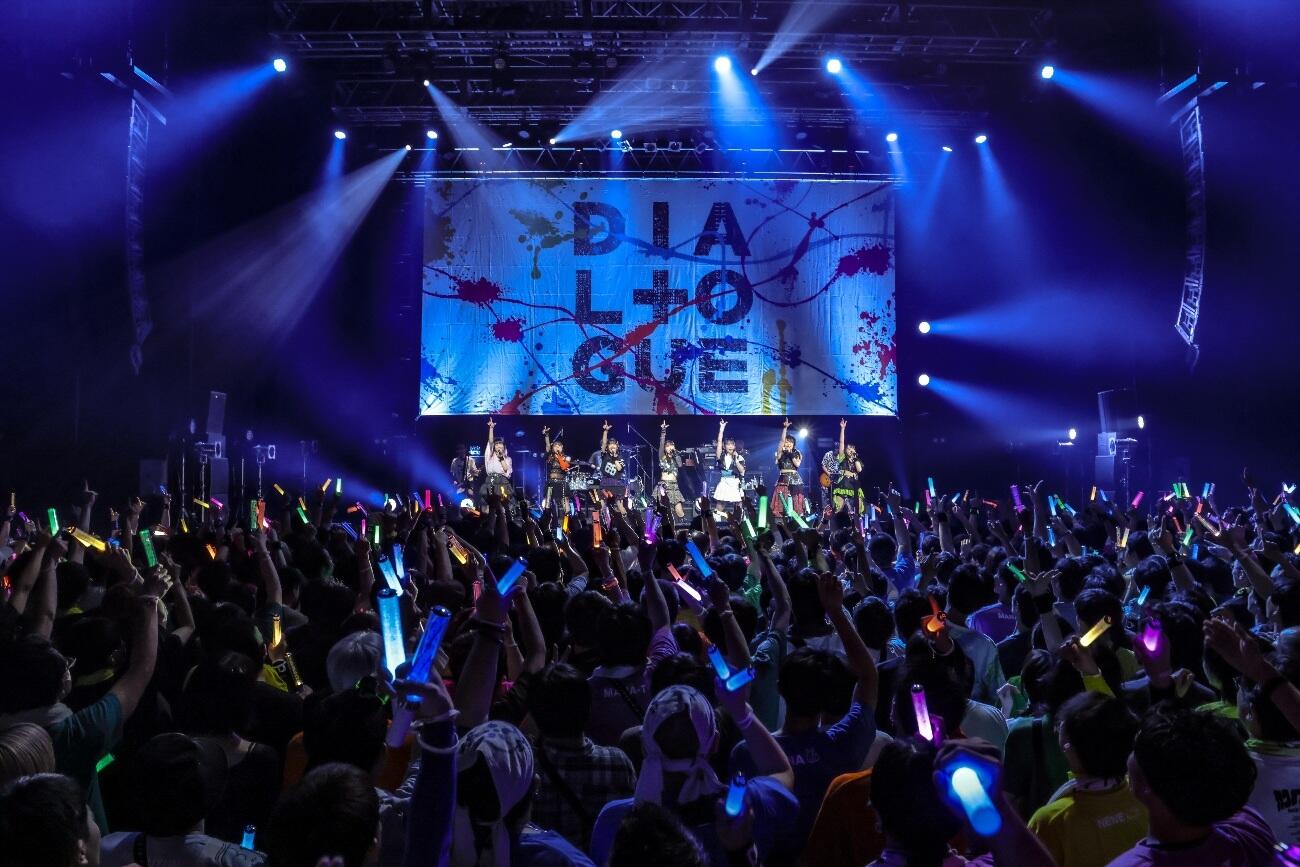 本公演は14時半開演で、会場周辺はそれぞれの推しメンバーカラーのTシャツを着てライブグッズ、ファイナル記念バスタオルなどを身に着けた老若男女のログっ子が集結。入場すると、正面には大きなDIALOGUE+の旗が掲げられ、ステージにはバンド機材が並び、前方にお立ち台が3つ据えられたシンプルな構成。1階スタンディング、2階の座席指定部分までギッシリ埋まった盛況で強めの空調も熱気に押され気味。開演時刻が近付きバンドメンバーがスタンバイ。キャップを被った総合プロデューサー・田淵智也Pが登壇、拍手と歓声を浴びる。田淵智也Pはダイブやモッシュは禁止と伝えた上で、