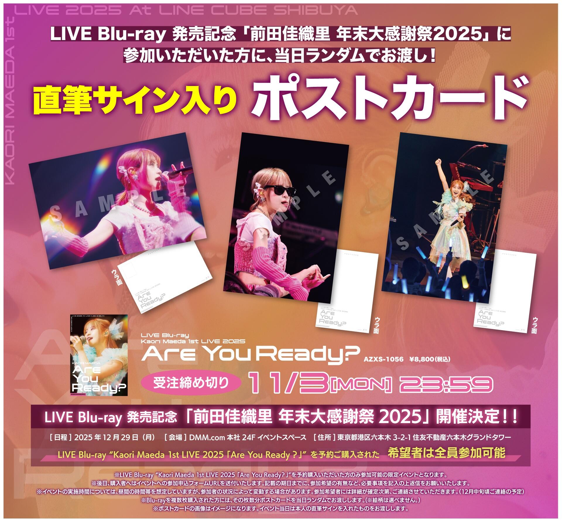 今回の映像作品、LIVE Blu-ray “Kaori Maeda 1st LIVE 2025 「Are You Ready?」”は、アーティストオンラインショップA!SMART(アスマート)での受注販売となり、受付の締め切りは、2025年11月3日(月・祝)23:59となっている。