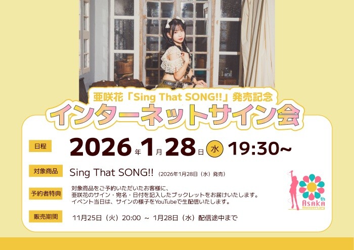 亜咲花初のカバーアルバム『Sing That SONG!!』の発売を記念してインターネットサイン会を開催します。