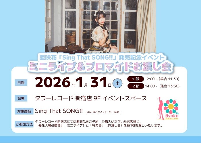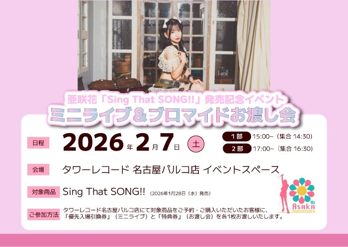 ネットサイン会や東京・名古屋でのミニライブなど、多彩な企画を実施します。対象商品<亜咲花『Sing That SONG!!』ATOM-0015>をご予約・ご購入でご参加いただけます。
