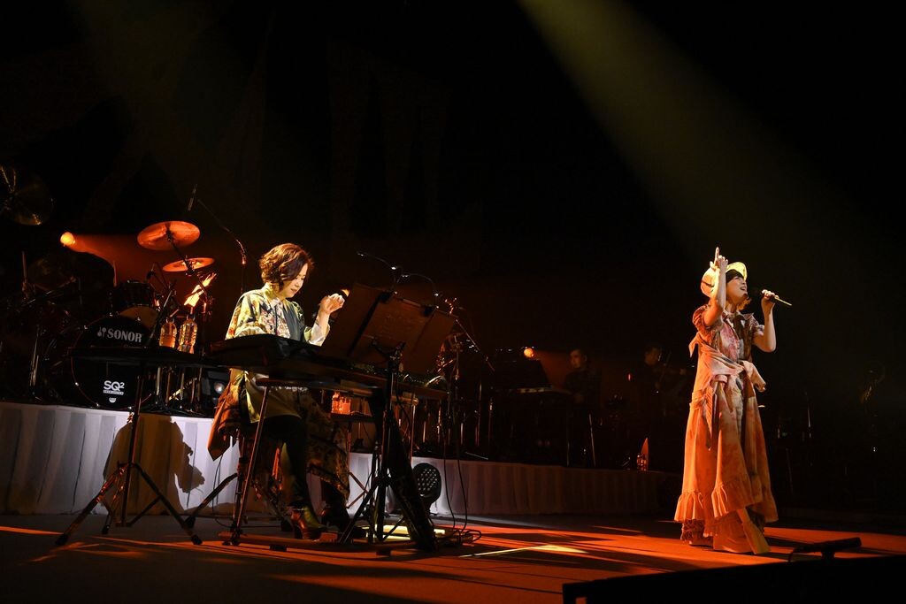ライブ中盤は、「今日はどれも昔話になっちゃう」(梶浦)という秘蔵エピソード満載のMCを挿みつつ、6thシングルの「また会えるから」(1995年)や、「Swimmer」のカップリング曲「うた」といった歴史を感じさせるナンバーを、『Dream Field』収録曲の「千夜一夜」や「夏の手紙」と合わせて披露。MCでは、二人でラジオ出演したときに梶浦が放送禁止用語を言ってしまい、局からのおわびアナウンスが入ったという失敗談も語られ、ファンの笑いを誘った。