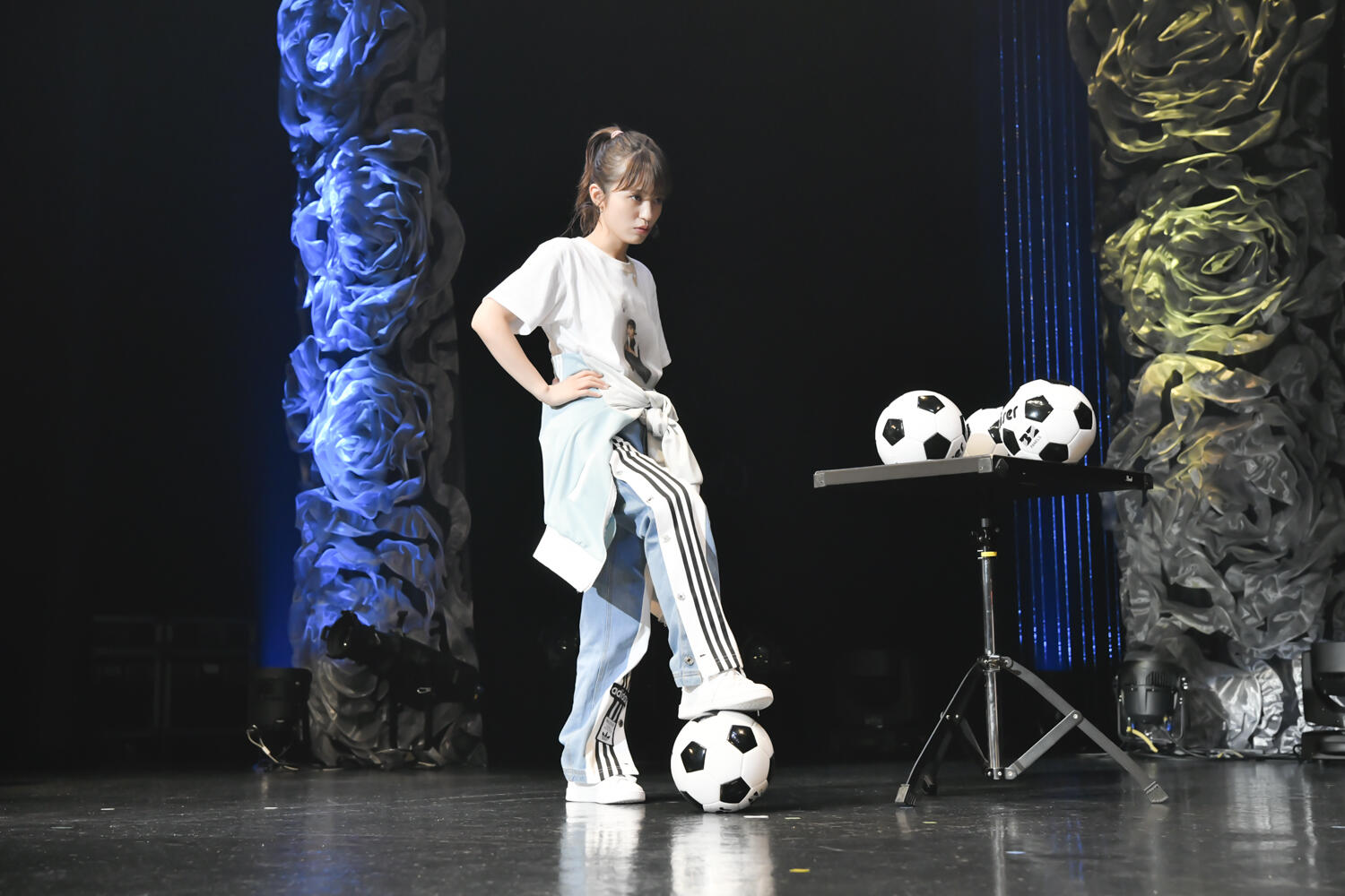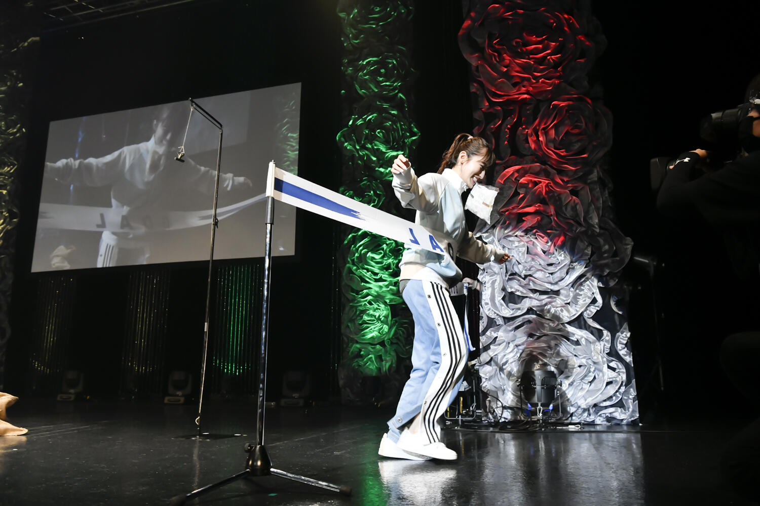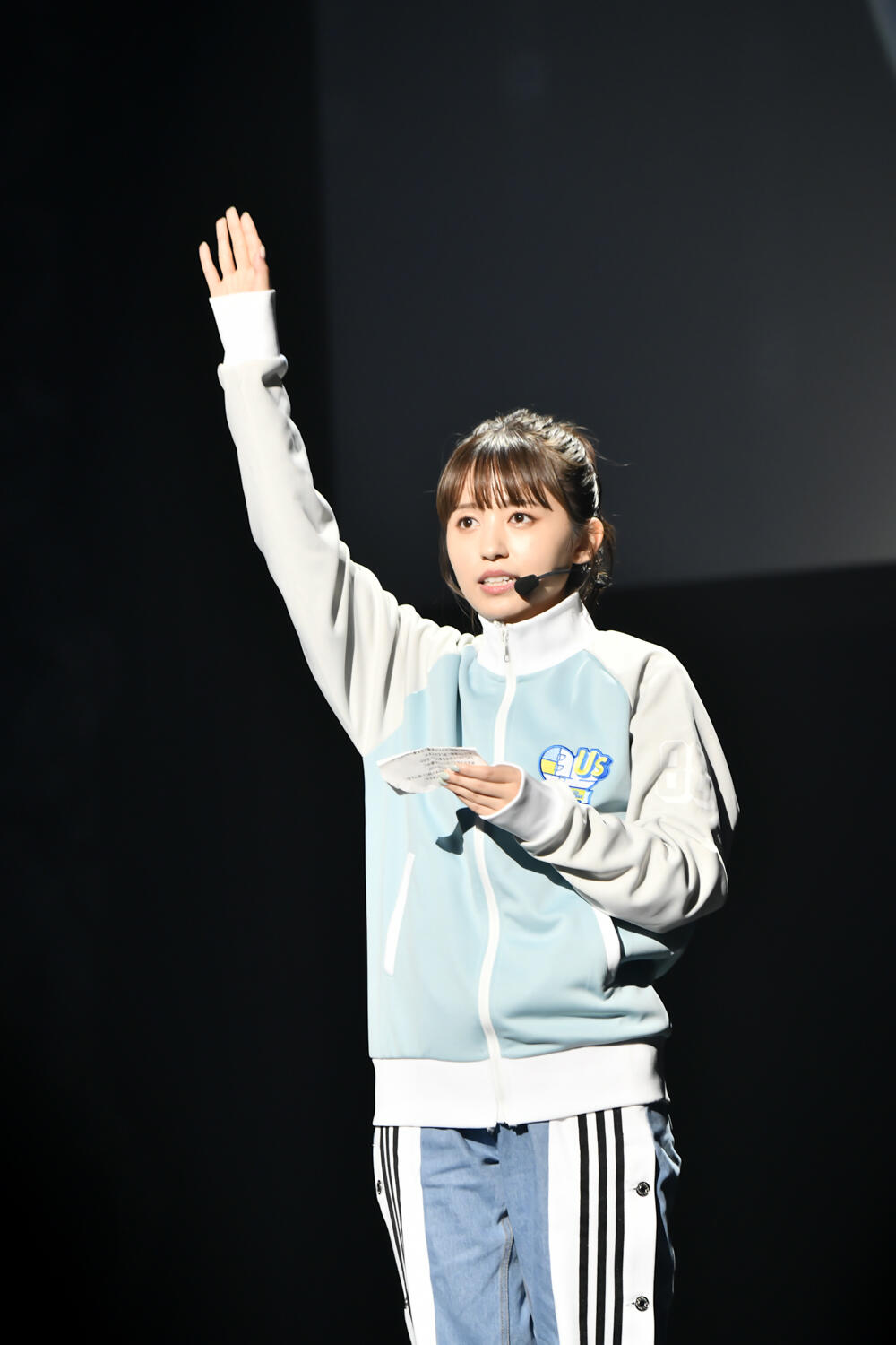そんなか会場が暗転し、ステージ中央にはこの日の主役・逢田梨香子が登場。ジャージ上下といういでたちで凛々しい表情のまま客席を見据えた逢田、おもむろに手をピンと伸ばして、「宣誓!」と勢いよく口火を切った……まではいいが、そこからは冒頭からカンペを読みながらのゆったりとした走り出し。しかし最後は力強く、「”ZEPP東京2021 逢田梨香子 夏の全力運動会“に参加することを誓います!」と宣言し、荘厳なBGMと共にこの日のイベントが幕を開けた。この日は東京オリンピックの最終日ということもあってか、どうやら今年のバースデーイベントは“スポーツ”をテーマに行われるようだ。