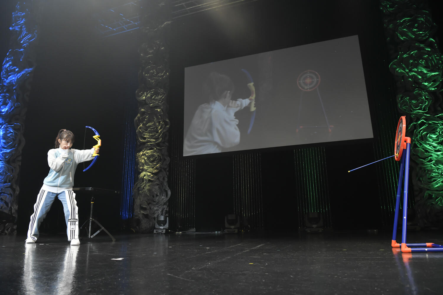 続いての競技は「アーチェリー」。ふたたび軽快なマーチに乗せて逢田選手が入場すると、「アーチェリーは夢の中でやった気がする」とこちらも謎の自信をのぞかせる。早速競技がスタートし、逢田がおもちゃの弓をひくと、矢はまんなかより下部の10点に刺さった。1射目から的にヒットさせたことに会場も驚きを隠せない様子だったが、逢田選手は「10点じゃ帰れない。真ん中(100点)に当たるまでみんな帰れない」と豪語。続いての第2射ではさらに中心の70点と100点まであと少しの成績を残すと、「あ、満足です」と急に競技の終了を宣言。しかし観客の拍手に乗せられて最後の一射へ。最後はより100点に近づくべく、的にもだいぶ近づいた結果、的から大きく外れて競技は終了。解説の遠山も「的は外しましたがお笑いは100点です!」と太鼓判を押した。